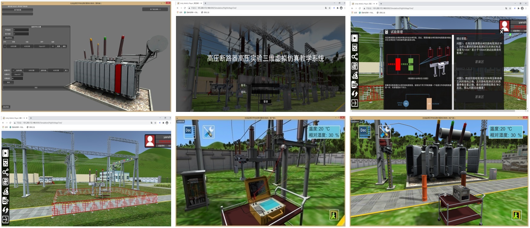 “電氣高壓試驗三維虛擬仿真系統”是以變電站高壓試驗科目為仿真對象,將高壓試驗置于一全三維仿真變電站環境中,對儀器設備的外形及功能進行全方位模擬,實現在三維虛擬變電站環境中進行高壓試驗的過程仿真。系統設計故障設置功能模塊,通過設置故障來對學員進行測試考核,檢驗學員對儀器設備的操作熟練程度以及對測量結果分析的正確性,實現對學員的考核評定與技能鑒定。具有局域網C/S架構和基于國家級虛擬仿真項目的互聯網模式B/S架構。